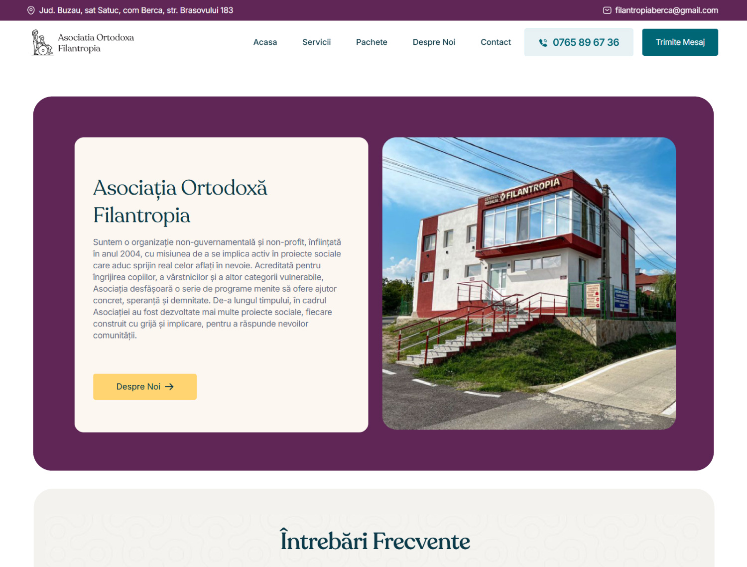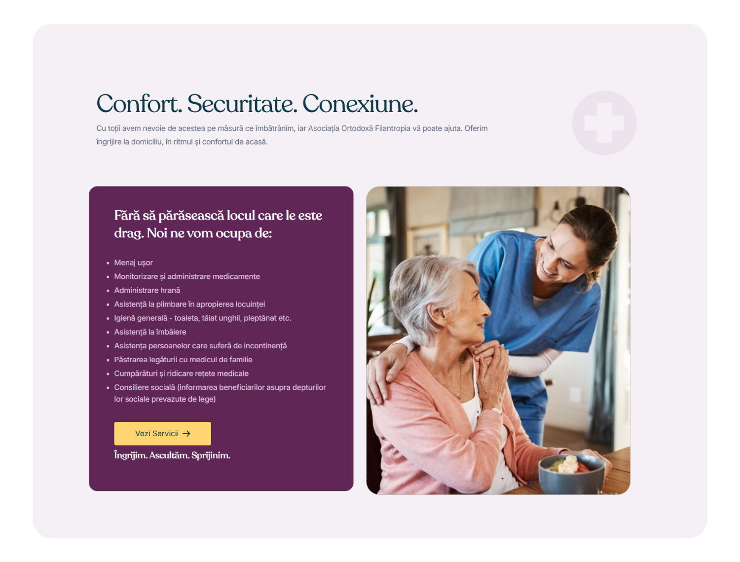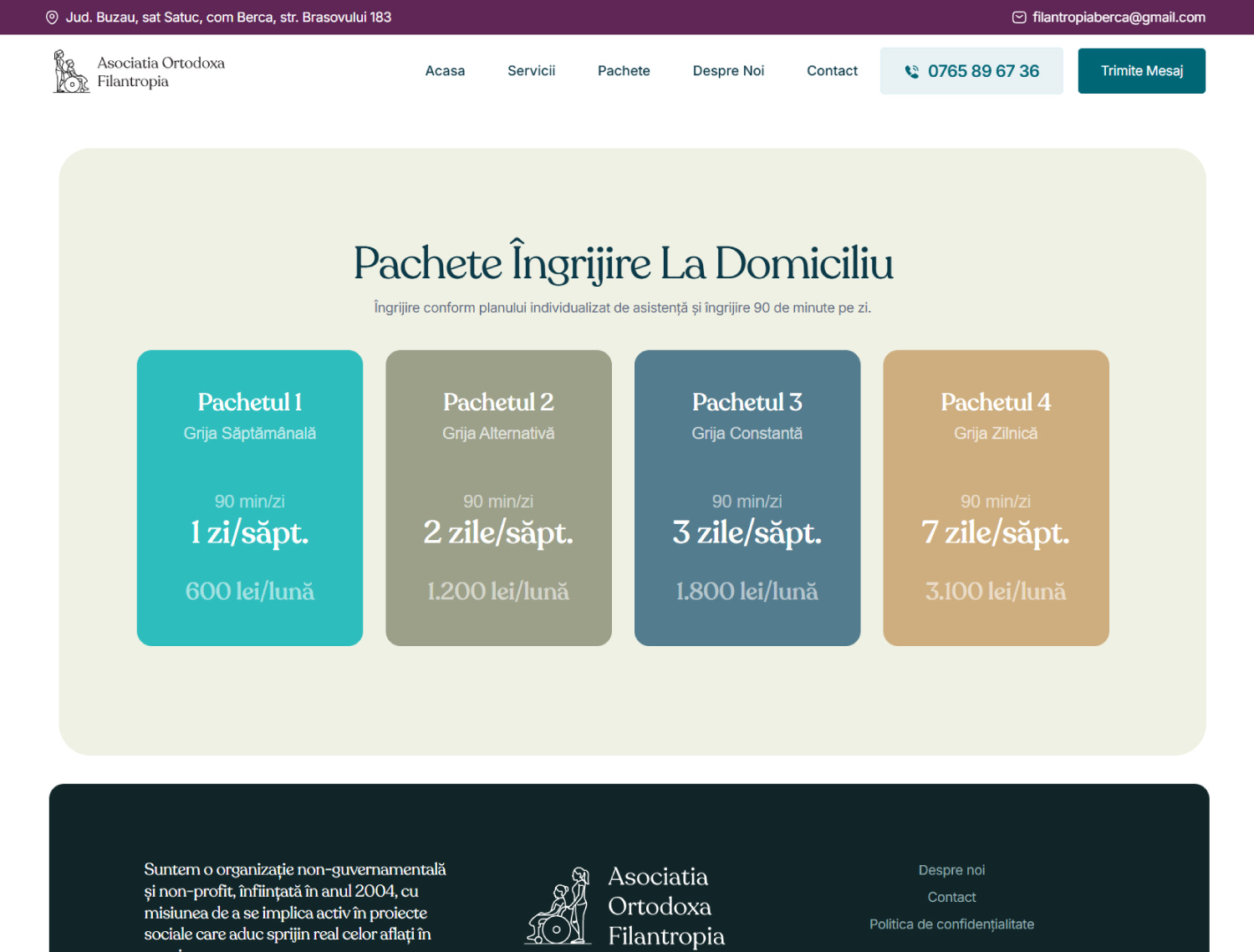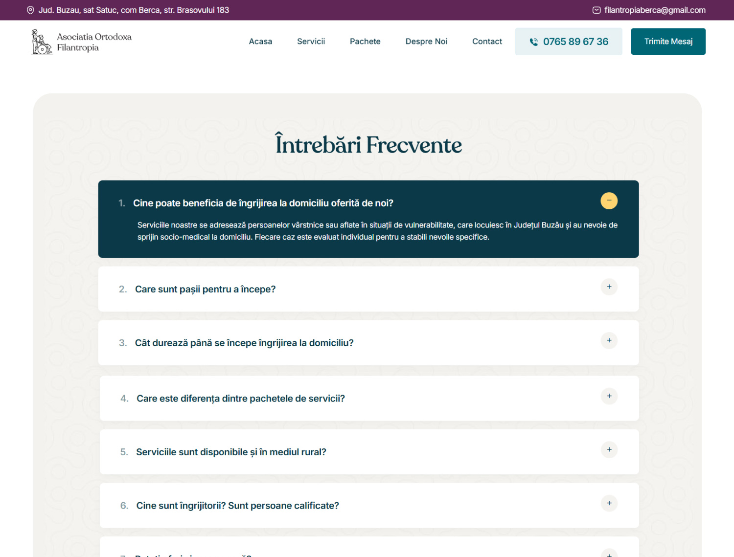 The Home Care Services website is a modern, minimalist, and airy platform developed by Better Brands for Asociația Ortodoxă Filantropia Berca. The site’s goal is to provide clear, accessible, and emotionally engaging information about home care services available in Buzău County, emphasizing care, connection, and dignity for elderly or vulnerable individuals.
